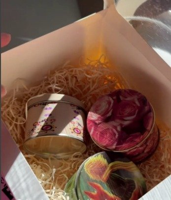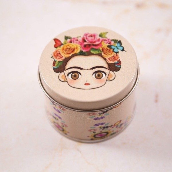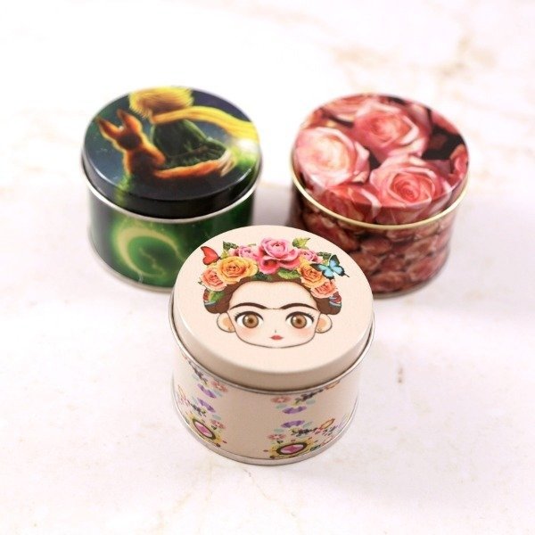Incluye caja con tres latas (una con motivo de Frida Kahlo, otro con El Principito y otro con rosas) con fragancias sólidas para el hornito aromático y 3 velitas de noche para colocar en la parte de abajo del hornito.